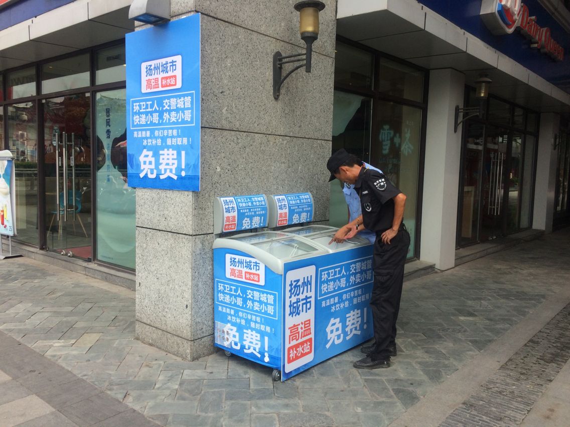 8月6日起,针对高温天气,珍园街区携手扬州生活网,共同发起“爱心冰箱送清凉”活动,免费为环卫工人、交警同志、快递小哥、外卖小哥等广大室外一线工作者提供冷饮、矿泉水等降温补给品,展示企业社会责任,展示扬州城市关怀。 工作人员早上在冰箱里装满数十种降温补给品,不到2个小时,降温补给品便被享用完。工作人员随即进行补充,方便有需要的市民能随时进行防暑降温。取到冷饮解渴的交警同志和环卫工作纷纷表示,在闹市区设立免费冰箱,不仅给室外工作者送来一份清凉,更送来了关爱与正能量,让他们享受到味蕾和心灵上的双“清凉”。(珍园 王悦)