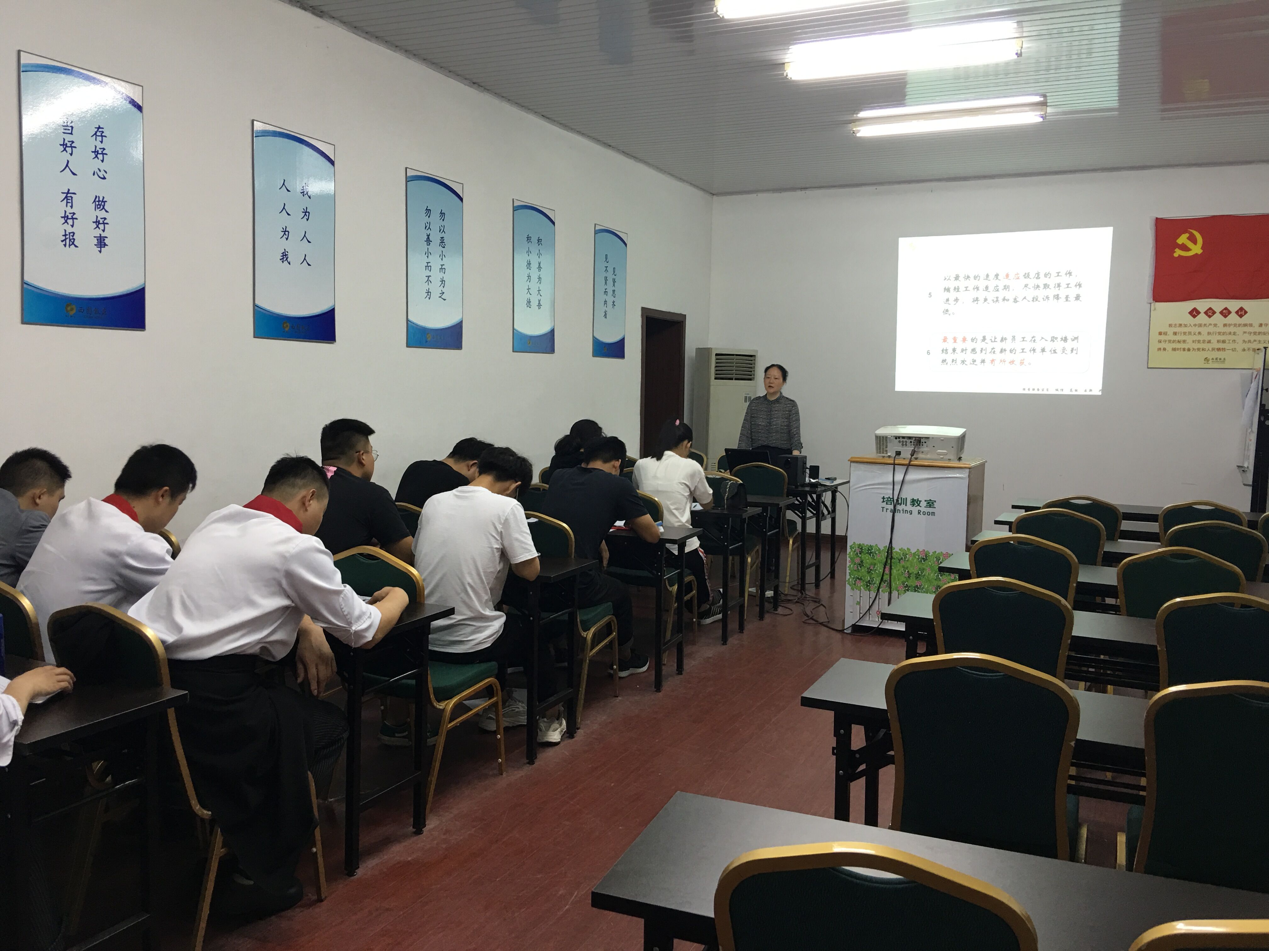 为了让新员工更好融入工作环境中,增强他们的归属感和责任感,西园饭店近期举办了一期新员工入职培训班。来自饭店前台部门的13名新员工参加了此次培训。