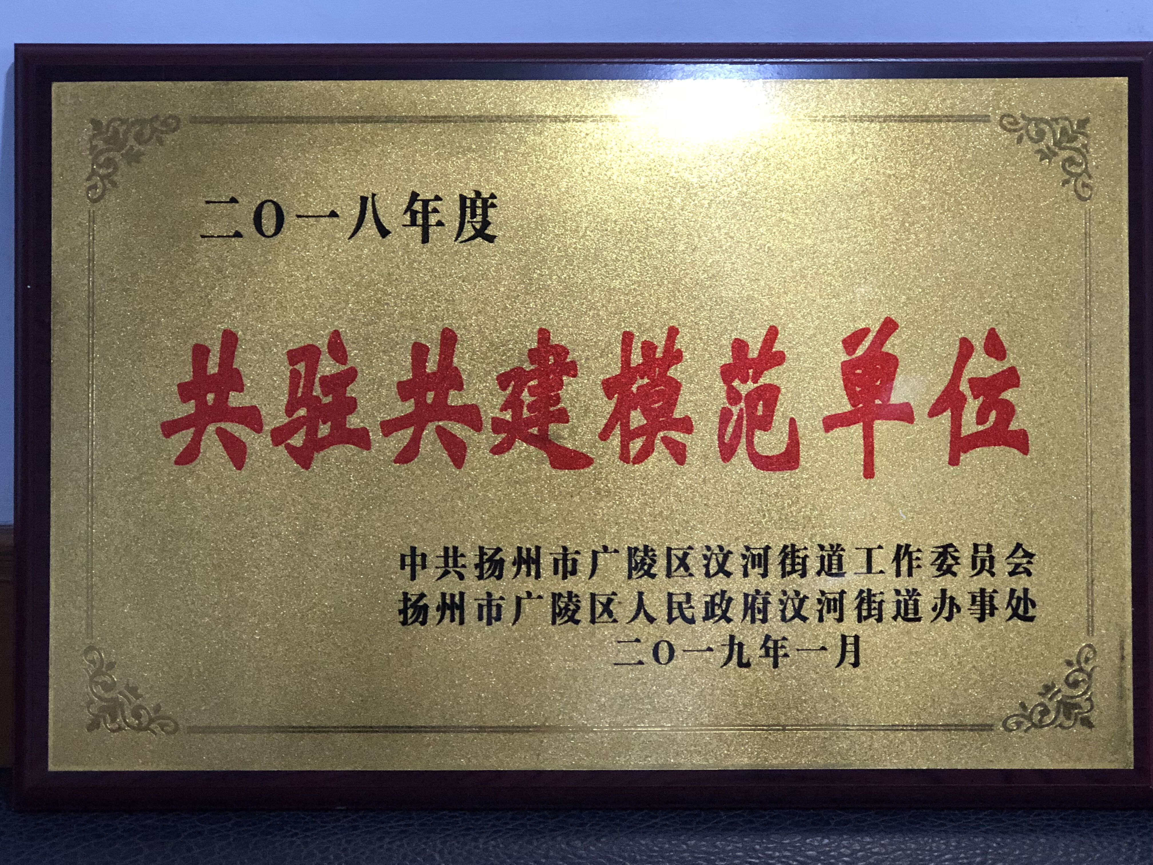 1月28日,扬子江置业公司被扬州市广陵区人民政府汶河街道授予“2018年度共驻共建模范单位”荣誉称号。