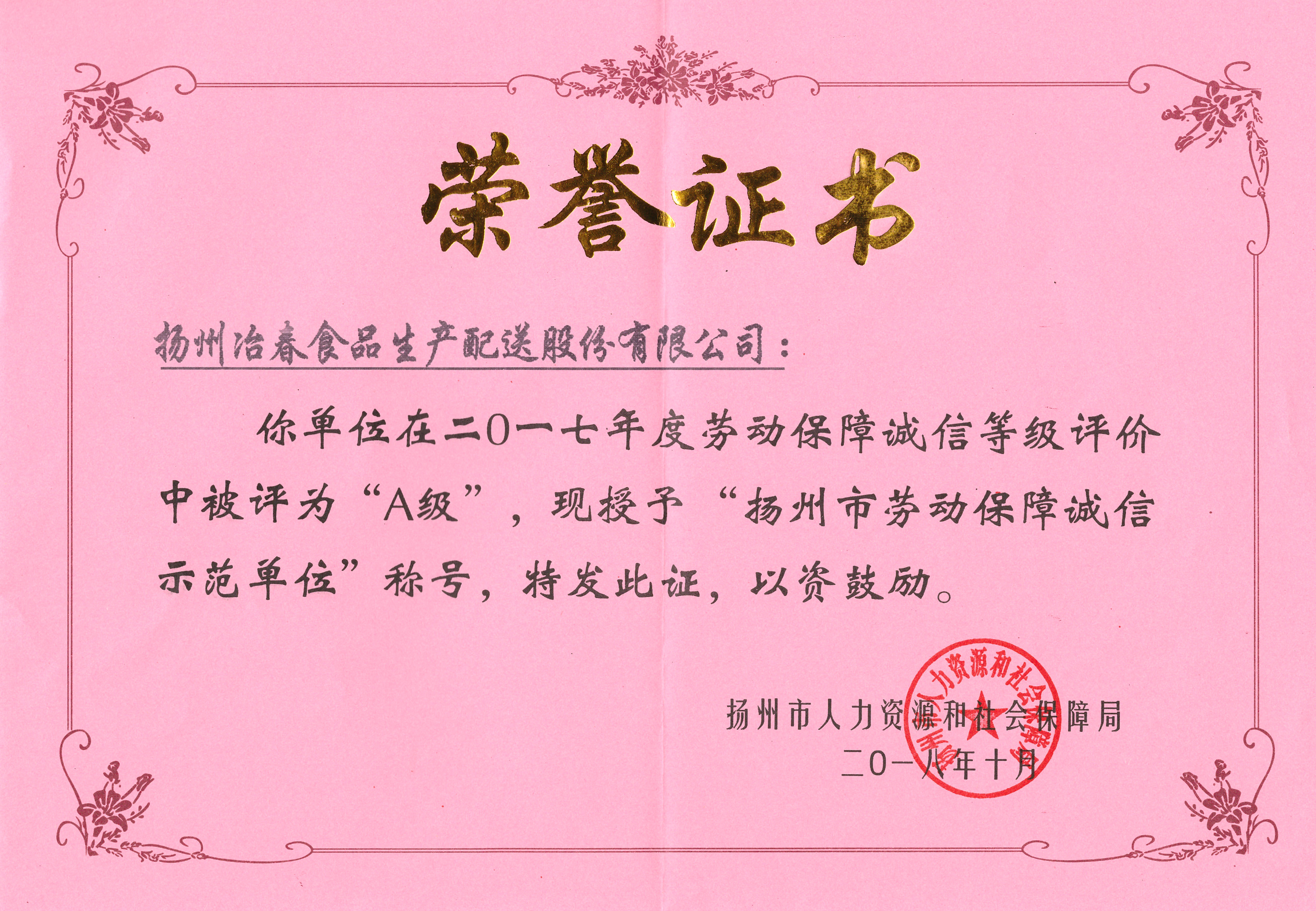冶春食品荣获市劳动保障诚信示范单位