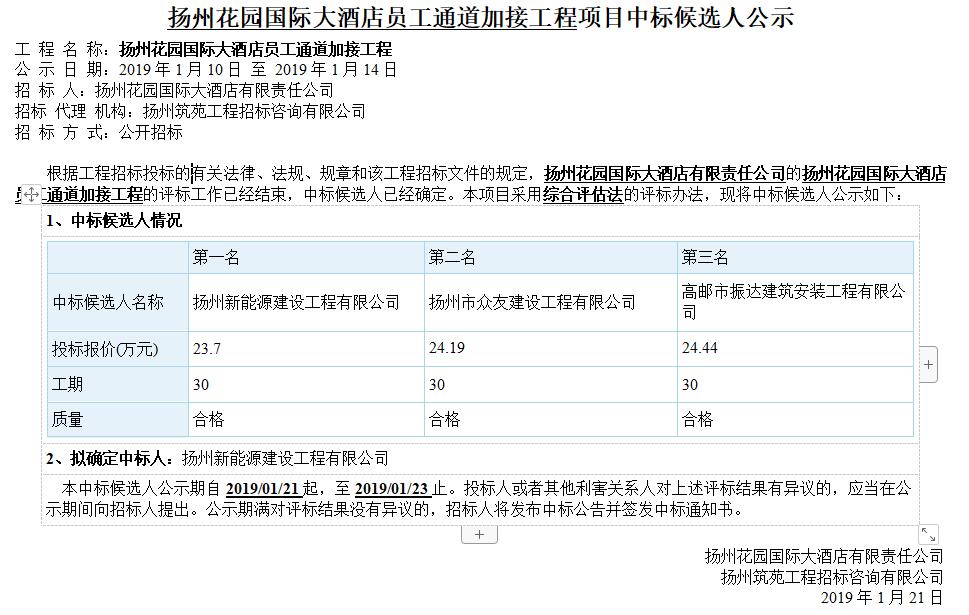 扬州花园国际大酒店员工通道加接工程项目中标候选人公示