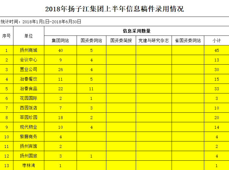 2018年二季度,市国资委共采用集团信息稿件60篇,在14家市属国企里排名第一(一季度采用33篇,排名第三。上半年共采用93篇,排名第二)。这是各单位及集团各部门高度重视、积极写稿投稿、共同努力的结果。现将扬子江集团2018年上半年信息稿件采用情况统计如下,望各单位及集团各部门下半年继续挖掘工作亮点、撰写报送信息、共同完成宣传工作,并在保证数量的同时提高稿件质量。