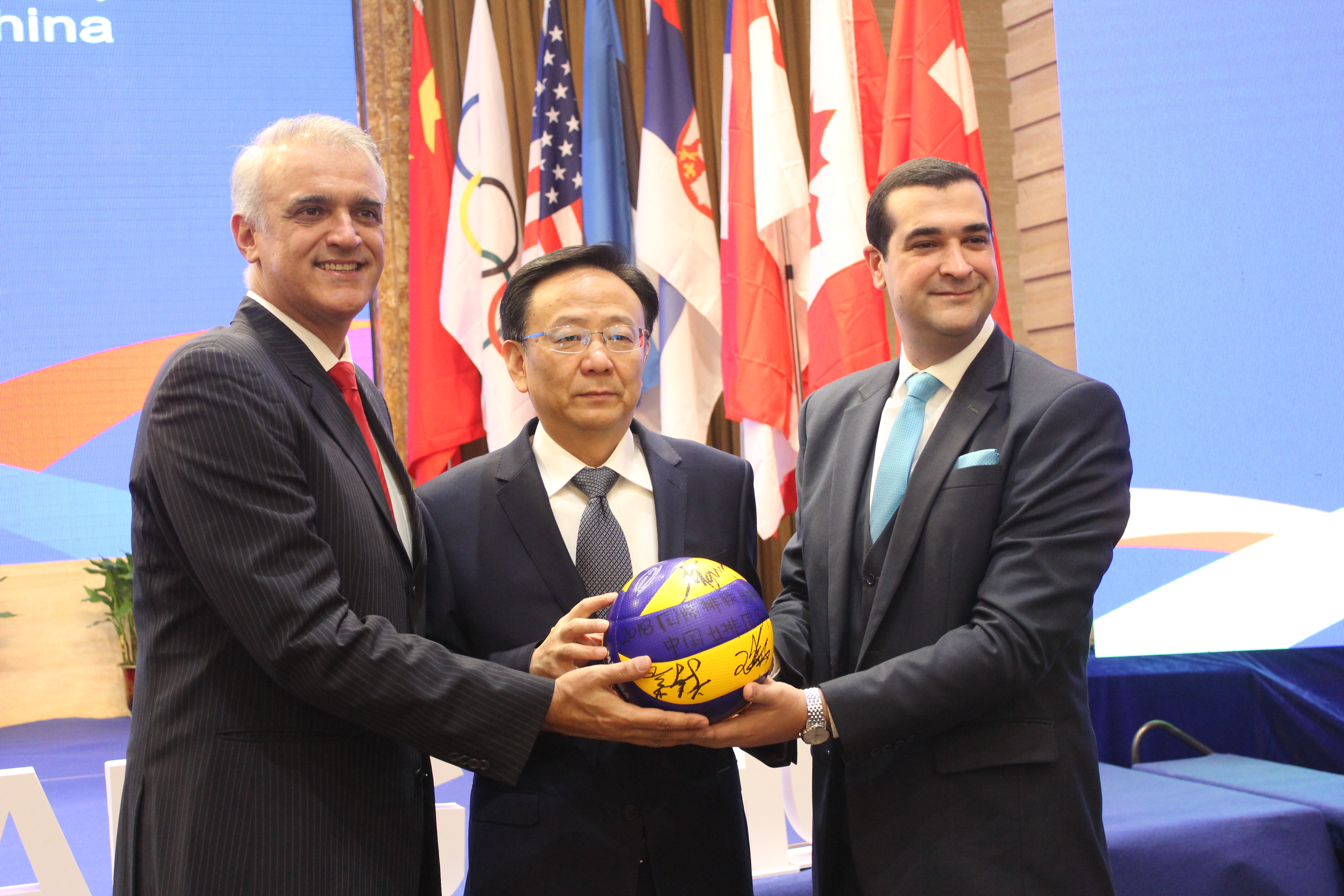 ![]() (国际排联商务主管马里奥-梅德罗斯向扬州市代市长夏心旻赠送排球)