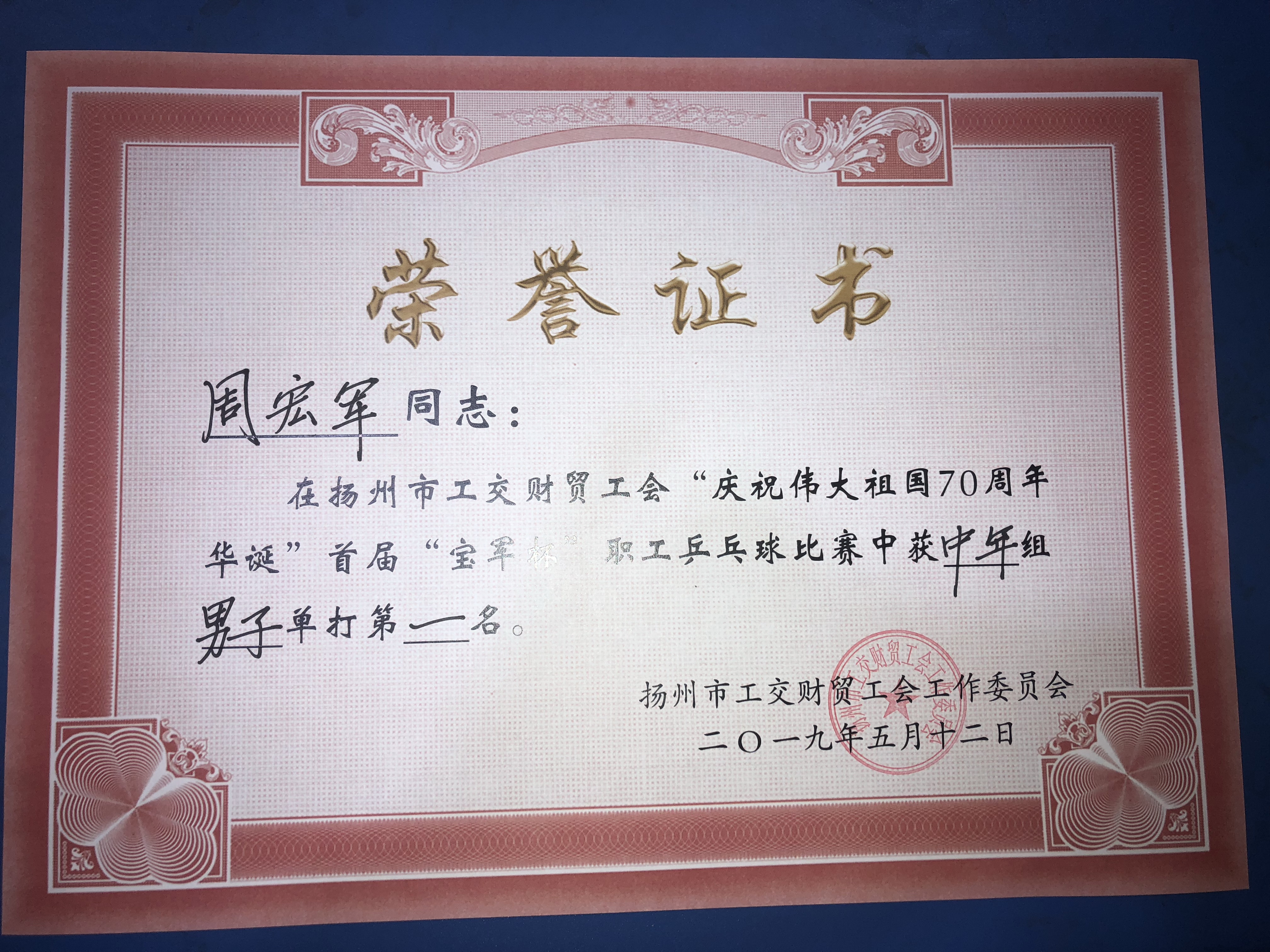为庆祝新中国成立70周年,丰富职工的文体生活,5月12日,扬子江集团选拔优秀选手组队参加市公交财贸工会举办的“庆祝伟大祖国70周年华诞”首届“宝军杯”职工乒乓球比赛。 此次比赛采用单循环、11分制赛制,分设青年组男子单打、青年组女子单打、中年组男子单打和中年组女子单打四个项目。经过一天的激烈对抗,最终代表集团参赛的扬州商城周宏军夺得中年组男子单打第一名,西园饭店邵堂获得中年组男子单打第三名,珍园实业公司刘磊获得青年组男子单打第三名。周宏军也将代表市公交财贸工会参加市第十三届运动会。(集团党办 沈扬) |