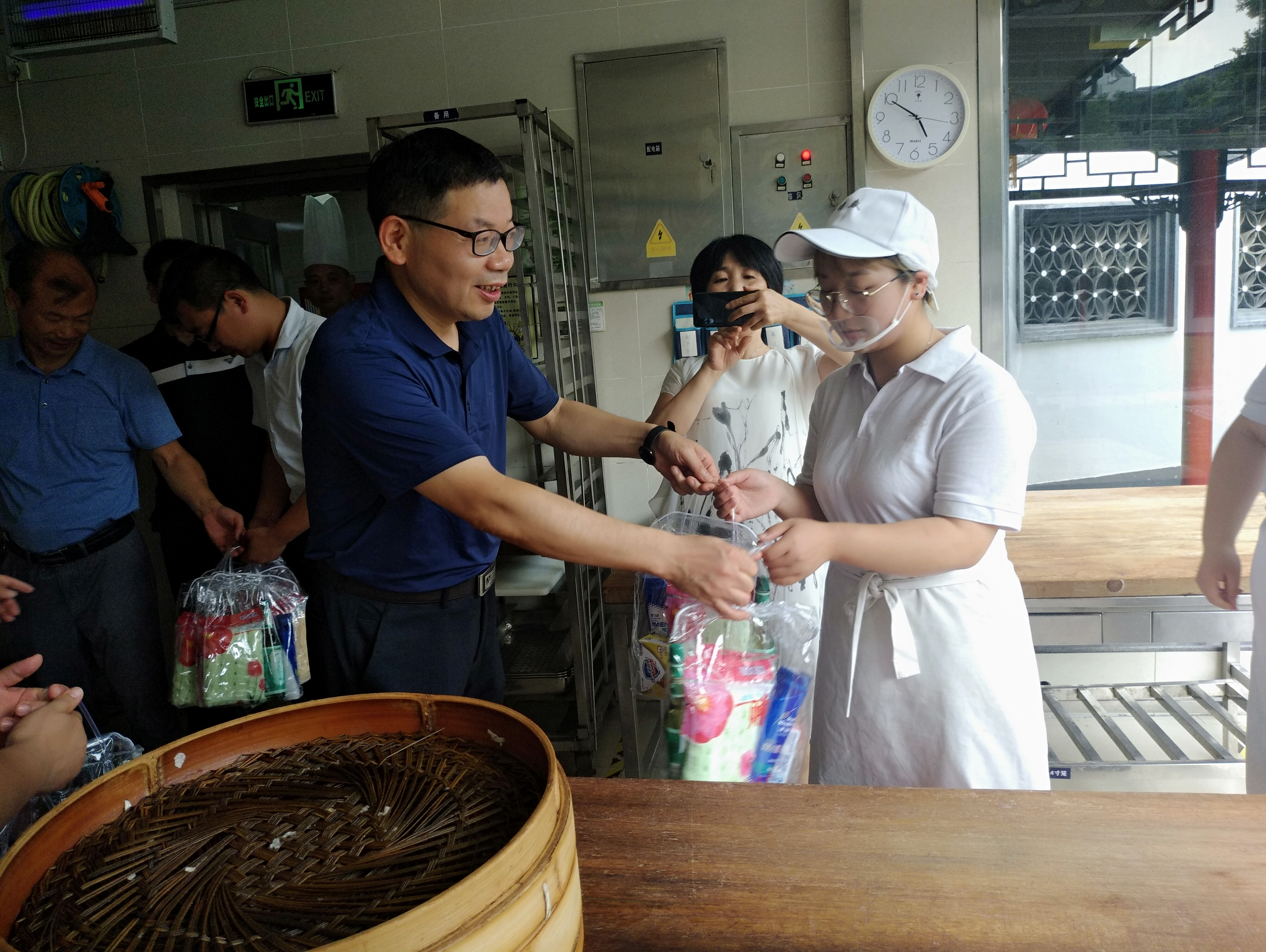夏日炎炎,持续高温,7月30日下午,扬州市总工会副主席陈维权,市工交财贸工会主任凌月明、副主任王宽道一行来到冶春御马头店,为高温之下坚守岗位的冶春一线员工送上降温解暑慰问品。集团党委办副主任高亮及冶春餐饮公司相关负责人陪同参加慰问。 慰问中,工会领导与一线员工进行了亲切交谈,仔细了解一线员工的工作情况。冶春餐饮公司副总厨师倪秋香主动向总工会领导汇报了“倪秋香劳模创新工作室”的工作动态,陈维权对冶春面点师傅精湛的手艺、起早带晚默默奉献的精神表示赞扬和感谢,叮咛他们要注意劳逸结合,合理安排工作,把好食品质量关,守好食品安全红线。(冶春餐饮 王美) |
