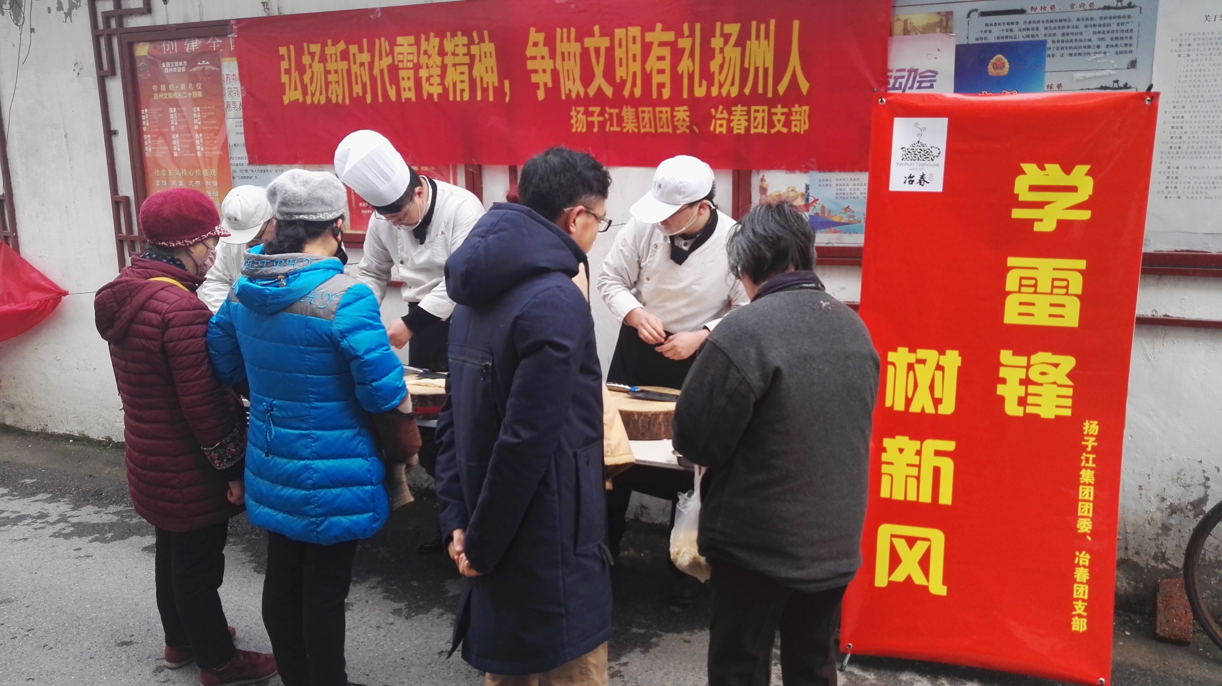 在第55个学雷锋日到来之际,集团团委组织青年厨师志愿者深入汶河街道常府社区,为居民义务提供烹饪食材加工服务——切干丝、剁砧肉,在提供服务的同时,展现了集团厨师扎实的厨艺基本功和文明有礼的对外形象,活动得到汶河街道常府社区及广大居民的热烈欢迎。
