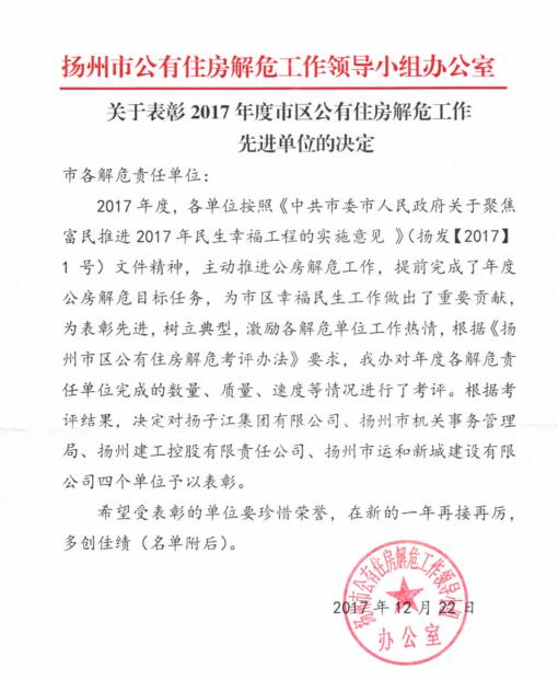 近日,市共有住房解危工作领导小组办公室发来2017年度公房解危工作表彰单位名单,扬子江集团荣获一等奖。 2017年市委、市政府1号文件要求集团完成1000㎡公房解危工作。在政府相关部门的支持和指导下,集团8月份已提前超额完成1475.6㎡解危任务,45家住户解决危房困难,其中包括异地安置解危5户、面积178.20㎡,修缮公有住房40户、面积1297.4㎡。下一阶段,将加大对遗留问题的处理力度,同时继续做好2018年的解危工作,力争全面落实完成好市委、市政府交办的工作任务。(集团办公室)